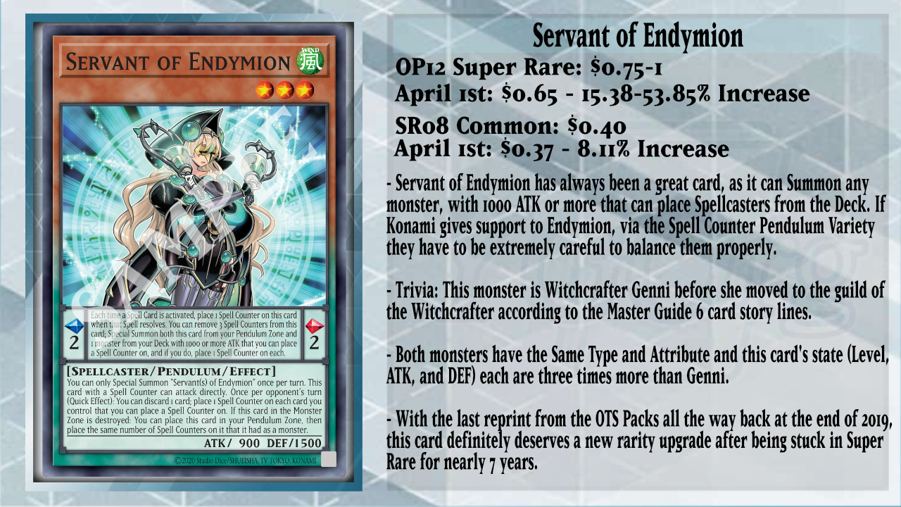 With great power comes great responsibilities, especially for Witchcrafter Genni… I mean Servant of Endymion. Being the precursor to Witchcrafter Genni before becoming a Witchcrafter monster, Servant of Endymion is one of the best cards to pick up early if you have an interest in building Endymion in the future. While in the Pendulum Zone, this card gains 1 Spell Counter each time a Spell Card is resolved. You can remove 3 Spell Counters from this card to Special Summon both it from your Pendulum Zone and a monster from your Deck with 1000 or more ATK that can place a Spell Counter on, and each monster gains 1 Spell Counter if you do. This effect is amazing for Special Summoning Mythical Beast Jackal King so you can set up a way to negate the activation of your opponent’s monster effects and destroy those monsters by removing 2 Spell Counters. While in the Monster Zone, Servant of Endymion can attack directly when it has a Spell Counter, and once per turn, you can quickly discard 1 card to place 1 Spell Counter on each card you control that you can place a Spell Counter on. Finally, if this monster is destroyed in the Monster Zone, you can place this card in your Pendulum Zone with the same number of Spell Counters it had when it was a monster.