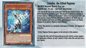 On the Magistus side of things, Crowley, the Gifted Magistus has been creeping up in price as the Spellcaster Pile grows in power. If Crowley is used as a Fusion Material, while on the field, you can treat it as Aleister the Invoker, and if this card is added to your hand, except by drawing it, you can Special Summon it. If this card is Normal or Special Summoned, outside of the Damage Step, you can Fusion Summon 1 Magistus or Invoked Fusion monster from your Extra Deck using monsters from your hand or field. This plays perfectly into the new wave of Invoked cards as they all just need an “Aleister” monster, in which you have the original Invoker, The Invoker of Madness, Reminiscent, and Crowley while on the field.