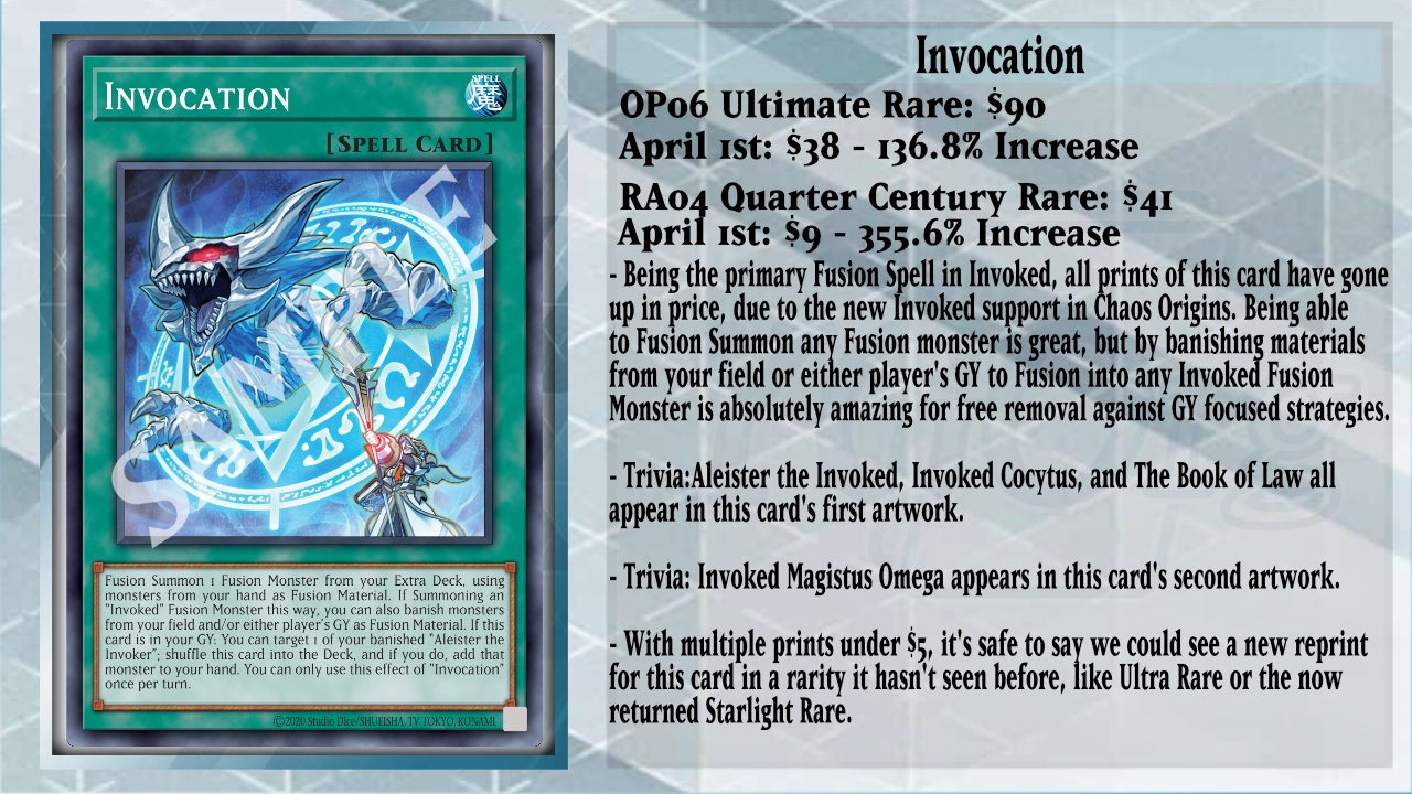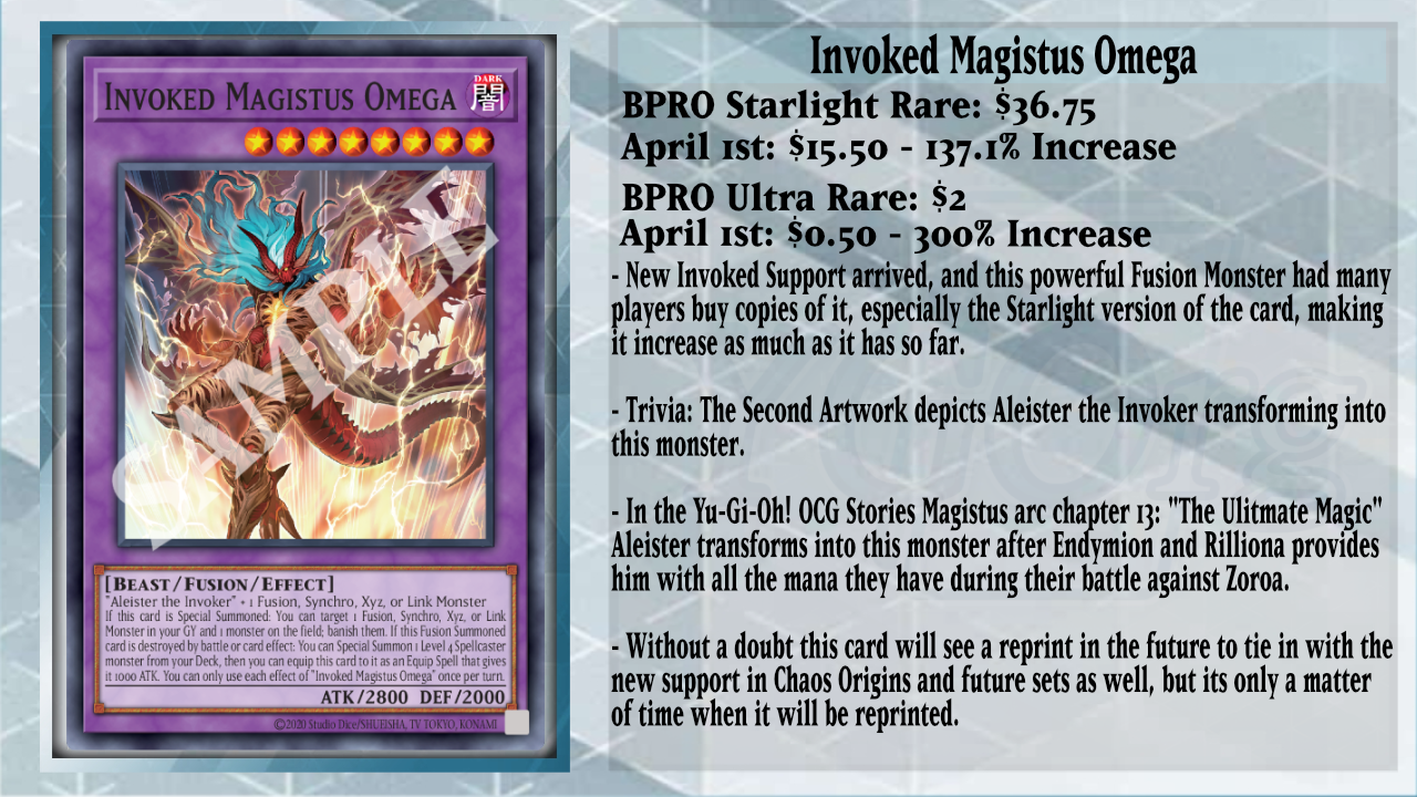 With a new age of Spellcasters being released, plenty of Invoked cards have been rising up in price, this has caused Invoked Magistus Omega to spike heavily for its Starlight Rare version. To Fusion Summon this card, you need Aleister the Invoker and a Fusion, Synchro, Xyz, or Link Monster, which is extremely likely in an Invoked Magistus Spellcaster Pile as they run every Summoning Mechanic known that is not named Pendulum at the current moment. On its Special Summon, this card can target a Fusion, Synchro, Xyz, or Link Monster in your GY and a monster on the field in order to banish them both. In addition, if this Fusion Summon card is destroyed by battle or card effect, you can Special Summon any Level 4 Spellcaster monster from your Deck, then equip this card to that monster as an Equip Spell that gives it an additional 1000 ATK. This makes it an excellent bridge for Fairy Tail and Charmer monsters, and is extremely powerful for bringing out Zoroa, the Magistus Flame or Crowley the Gifted Magistus from your Deck