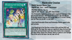 The last card we are going to cover is one of the best Witchcrafter Spells, and that is Witchcrafter Creation. The current going rate for its The Infinity Chasers Secret Rare copies are running for over $20 for North America. This card can add any Witchcrafter monster from your Deck to your hand, and during your End Phase, if you control a Witchcraft monster, you can add this card to your hand from your GY. The only downside about this is you can only use 1 of the effects or the other, like all the other Spells/Traps, so you have to pick and choose which effects you want to use and which ones you want to add back to your hand during your End Phase.