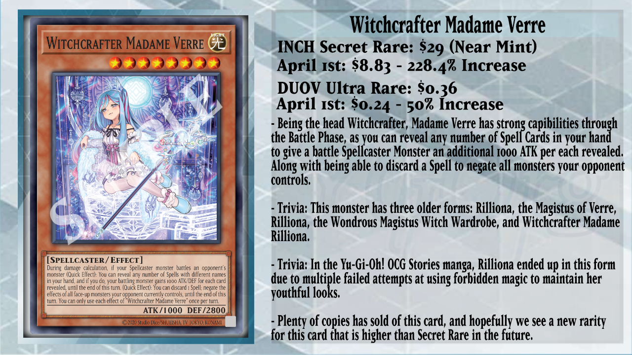 Finally, let’s dive into Witchcrafter for a really quick moment with Witchcrafter Madame Verre. Being the main and head Witchcrafter, the The Infinity Chasers Secret Rare copies of this card are extremely low on the market and Near Mint copies are demanding around $30 right now for North America, if you look past the Moderate and Heavy Played copies. During damage calculation, if a Spellcaster monster battles an opponent’s monster, you can quickly reveal any number of Spells with different names in your hand to make your monster gain 1000 ATK/DEF for each card revealed until the end of the turn. This can cause games to end quickly if you have more than eight Spells in your hand with different names. Once per turn, you can quickly discard a Spell to negate the effects of all face-up monsters your opponent currently controls until the end of the turn, which can turn the tides if your opponent doesn’t have a counter prepared.