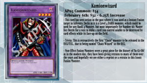 Finally, to end this shorter article, we happen to have Kamionwizard from Astral Pack 3, which was released in September of 2013 but originally released in Vol.2 in 1999 for Japan. This card has a home in past formats from its release in 2013 all the way into 2015/16 due to being an Instant Fusion tech for Infernity for their Rank 4 plays, such as Lavalval Chain, Evilswarm Exciton Knight, Abyss Dweller, Number 66: Master Key Beetle, and many more. Hopefully one day, we will see many of these old OTS Pack, Astral Pack, and Tournament Pack cards in general receive a reprint in the future for more accessibility for players who want to collect the older cards in the game for their collections.