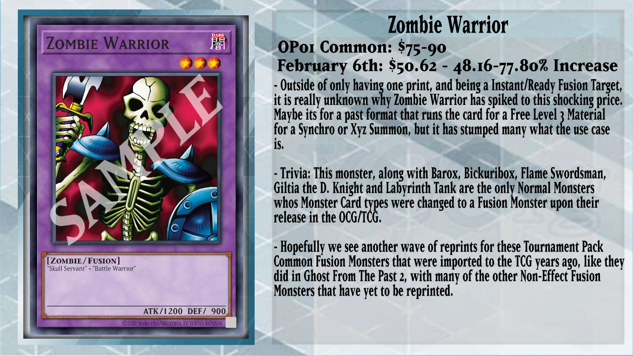 Another one of these cards that hasn’t seen a reprint since its import is Zombie Warrior from OTS Tournament Pack 1, while it was originally released in Vol.2 back in 1999 for Japan. This Level 3 non-Effect Zombie monster is magically over $70 in North America with no reprint in sight. This card took 17 total years to import and was used with Instant Fusion back in 2016 and 2017 for material for a Rank 3 or an additional Synchro Material if needed, but as of recent, it’s odd to see this along with many other cards spiking so hard in the recent months. With the new Pumpking cards from Maze of Muertos, this card could have some solace in the Deck for cards like Ghostrick Alucard or to help Link Summon Vampire Sucker, which can target and Special Summon 1 monster in your opponent’s GY to their field in Defense Position, and it becomes a Zombie monster, which allows you to draw 1 card via the other effect of Vampire Sucker.