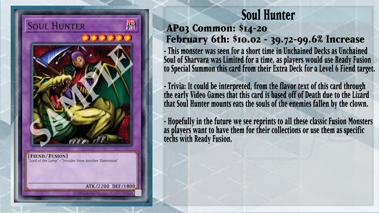 Leading from Zombies to Fiends, Soul Hunter is another monster that has been on my radar, as its original print was Astral Pack 7 in 2015, which originally was printed in Booster 5 back in 1999 for Japan. It was only as of late 2023 that we saw players using this card with Ready Fusion in Unchained Decks to replace the missing copy of Unchained Soul of Sharvara, as it was Limited at the time, but now with it being Semi-Limited still, players moved on from using this tech. This card’s price on the other side has been slowly rising up due to collectors and players who want to use Ready Fusion in their lists for additional Xyz or Link Materials for their monsters. This would be another perfect reprint in a set like Battles of Legend as an Ultra Rare foiling or even in an OTS Pack again as a Super Rare upgrade to give players a foiled option of the card.