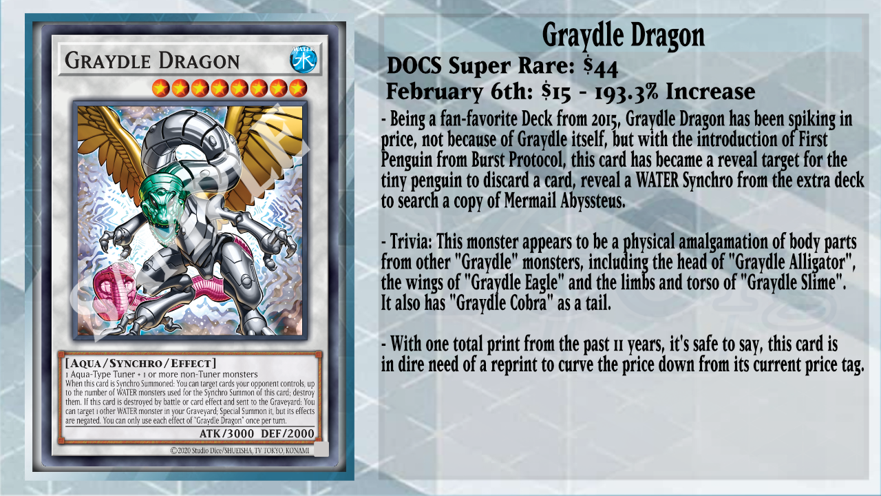 First up, we’re going to talk about a Synchro Monster that only has one total print from Dimension of Chaos, Graydle Dragon. The main reason why this card is rising in price is due to its solo printing and as a tech in Atlantean Mermail due to the release of First Penguin. First Penguin has added more consistency to WATER decks, as you can discard 1 card to reveal 1 WATER Synchro Monster in your Extra Deck and add a WATER monster from your Deck to your hand with the same Type but 1 Level lower. This is important as you can reveal your copy of Graydle Dragon and add from Deck to hand a copy of Mermail Abyssteus, or you can reveal Deep Sea Repetiteur to add a copy of Atlantean Dragoons. Being able to add a piece of your starting plays without using your Normal Summon thanks to First Penguin has given WATER Decks new hope going into the future.