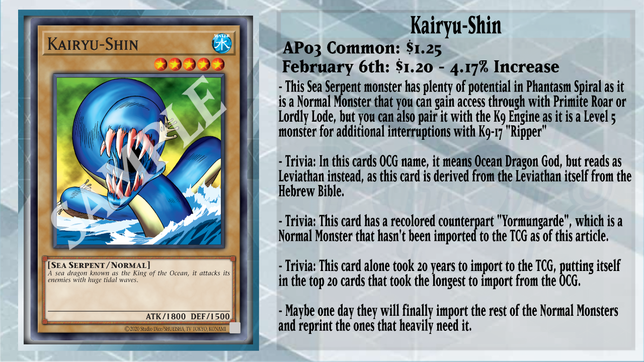 Plenty of Normal Monsters and non-Effect Fusion Monsters from the Astral Pack/OTS Pack Era tournament packs, and Speed Duel Normal Monsters have been seeing plenty of movements. Especially cards like the legendary Ocean Lord, Kairyu-Shin. This card was imported in the 2019 Speed Duel: Trials of the Kingdom set, along with many other Normal Monsters. Being a part of Umi Control, this is one of the options you can use for the Primite Engine along with Phantasm Spiral Dragon as the other target. The best use case with Kairyu-Shin is that it’s a Level 5 and can help access the K9 engine for K9-17 “Ripper” for a monster negate in the hand or GY, which can come up in most duels.