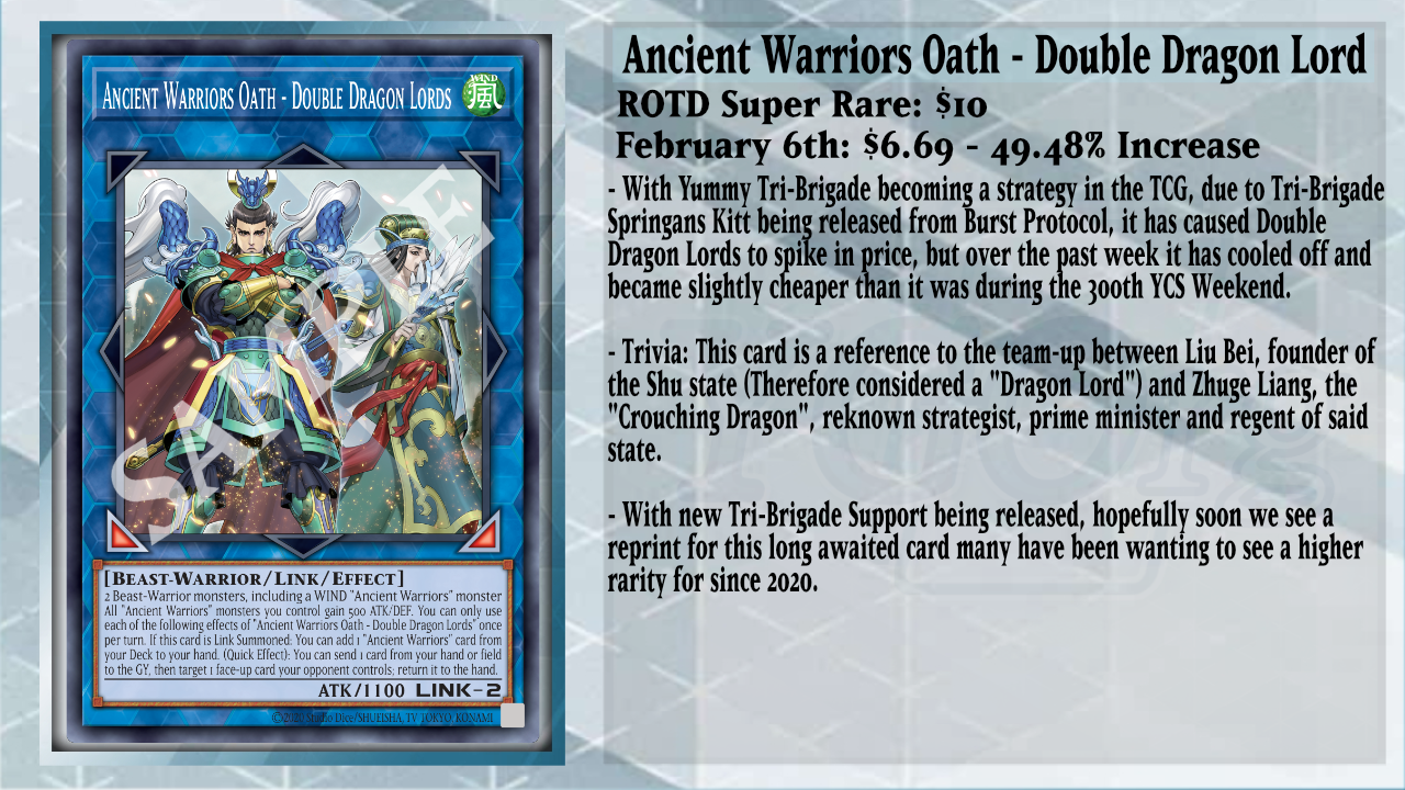 Due to the surge of Radiant Typhoon Yummy Tri-Brigade, Ancient Warriors Oath – Double Dragon Lord has been cleaned off the market as only having a single print from Rise of the Duelist, which now has slowly repopulated on the market. This is one of the many Link Monsters your Tri-Brigade monsters can access by banishing 2 Beast, Beast-Warrior, or Winged Beast monsters from your GY. Double Dragon Lord is an amazing end board piece, as you can quickly send 1 card from your hand or field to the GY to target and return 1 face-up card your opponent controls to the hand. This card is made early on in their combo after they revive their copy of Tri-Brigade Nervall from the GY with Tri-Brigade Springans Kitts’ effect, then you can use the Link-1 you would Summon using Nervall originally, like Linkuriboh or Salamangreat Almiraj and Nervall to access any Yummy Synchro Monster, as the Link-1 will be treated as a Tuner. Hopefully soon, we will see a new print for this amazing Link Monster, as it’s nearing 6 years without a reprint.