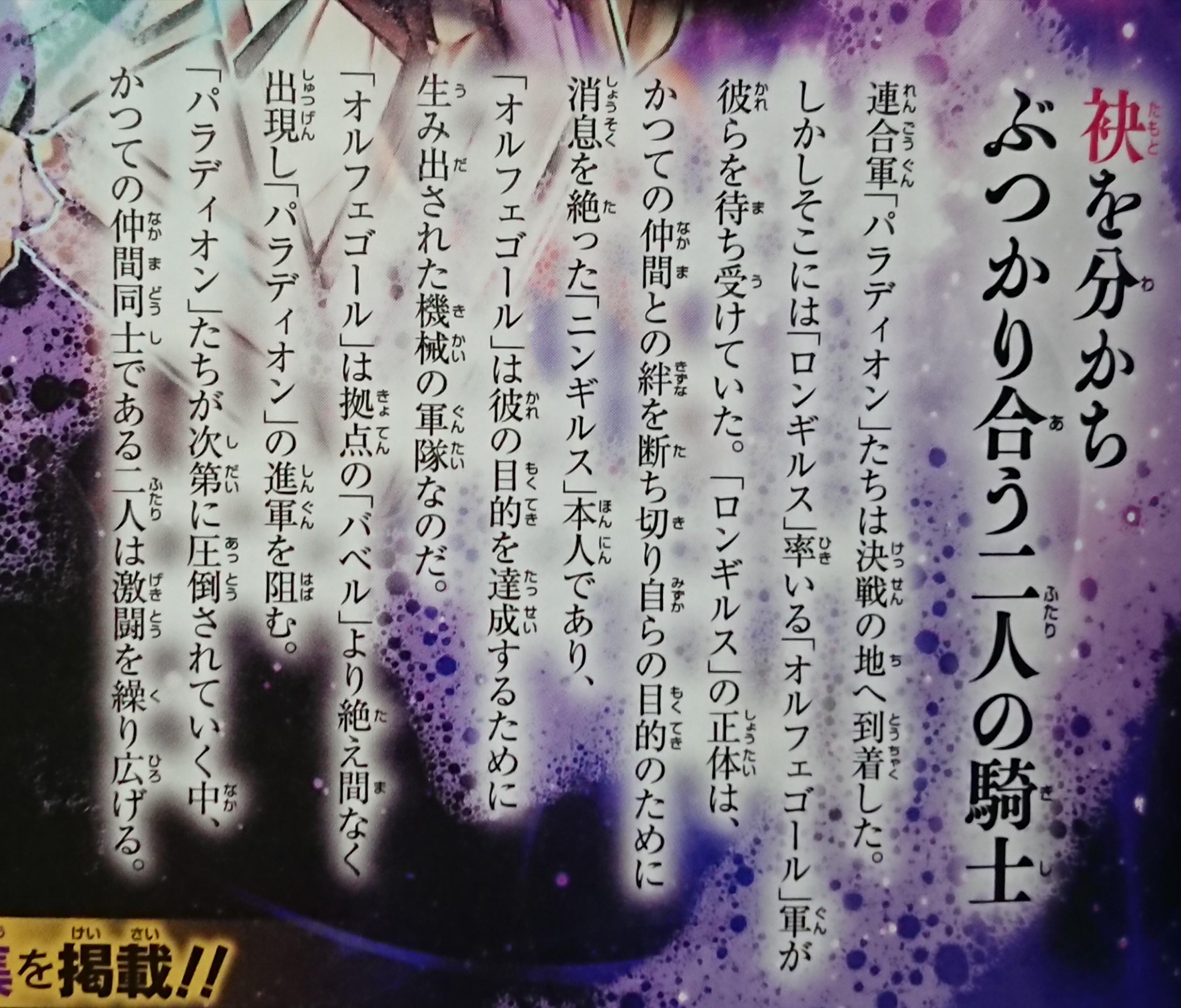 The “Crusadia” fellowship arrived at the place where the final battle would likely be fought. However, what awaited them was the “Orphegel Army”. The true identity of “Longirsu” is that of “Ningirsu” who severed the bonds of friendship with his former friends and disappeared with his own goals in mind. “Orphegel” is an army of machines he created to achieve his ultimate goal. The “Orphegel” continue to ceaselessly appear from “Babel” and prevent the “Crusadia” fellowship from getting any further. These two former friends now wage a fierce battle against one another.