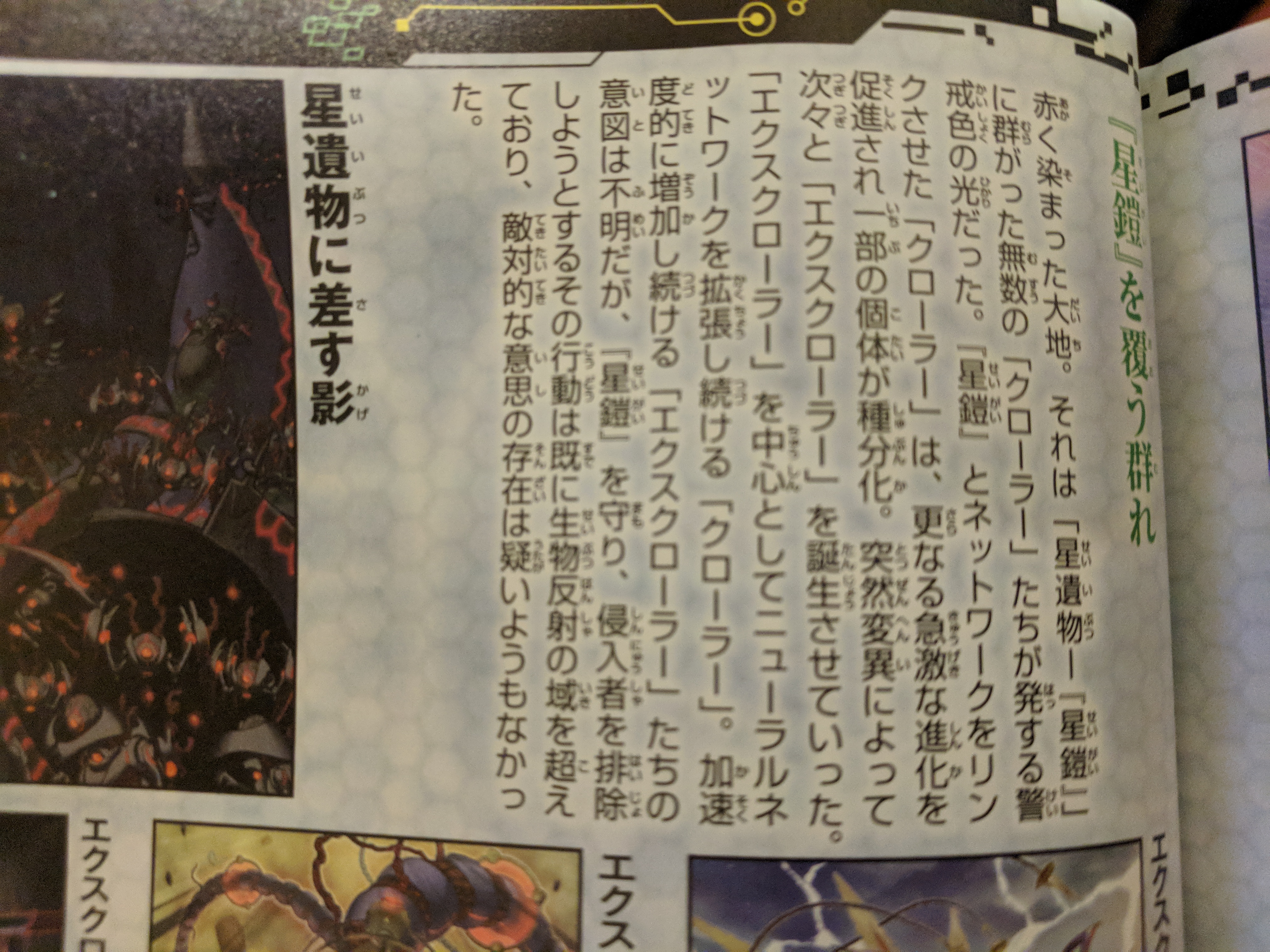 Mechanical lifeforms called the “Krawlers” multiply in the land where “World Legacy – “World Armor”” sleeps. With forms far too diverse to be called monomorphoic lifeforms, it’s believed they are the result of accelerated “adaptive radiation”, i.e. the rapid diversification of organisms into different evolutionary forms. They exist as a super-organism that work in parallel with one another using a unique Neural Network, and no member of the Krawlers has their own sense of identity. In the past, some parts of the Krawlers became extremely violent, but though it’s recorded they did attempt to invade the “Celestial Forest”, it’s uncertain why they did. If they lack an sense of self, what kind of ‘will’ is interfering with their behavioral principles to cause this?