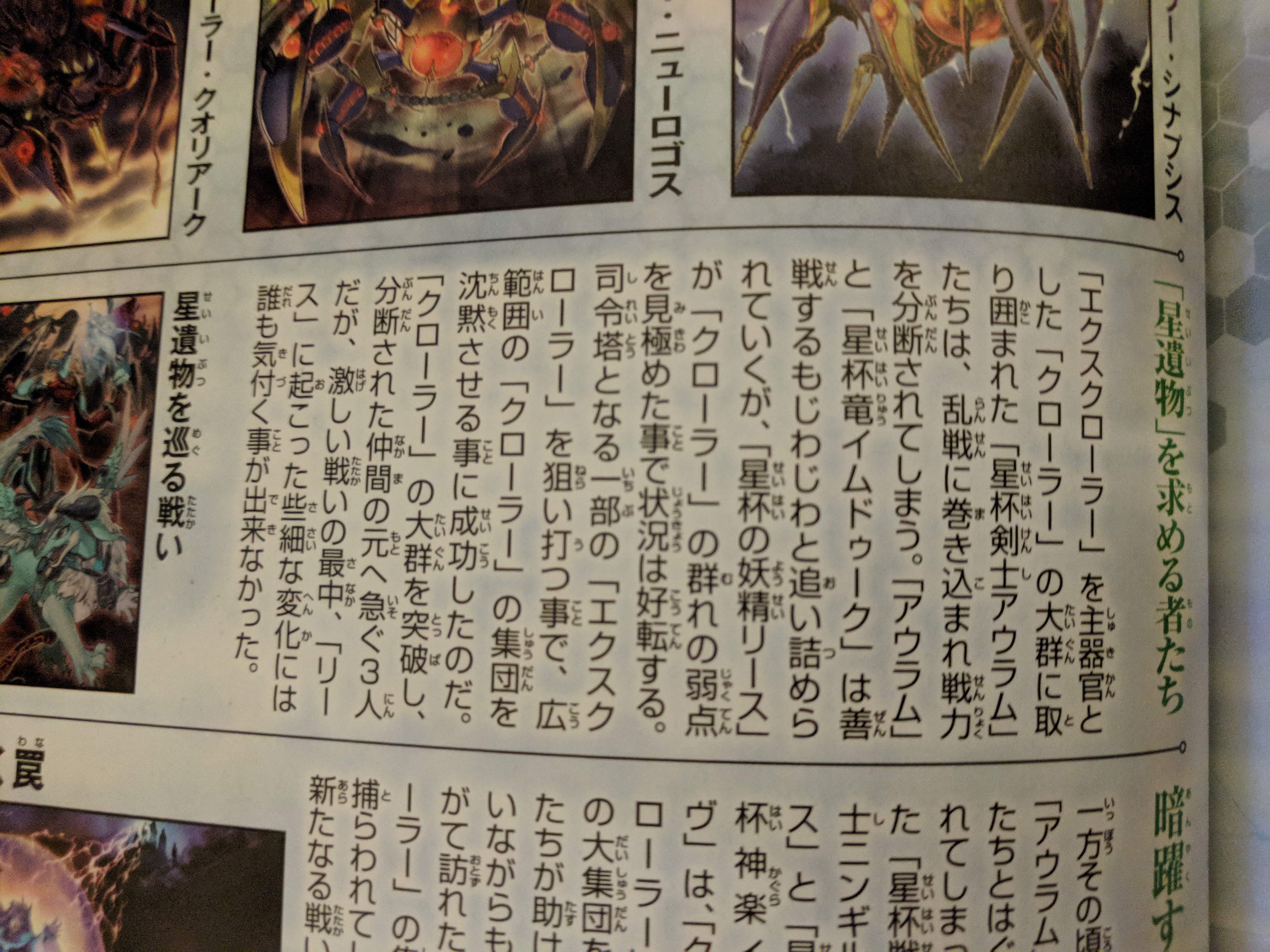 “Auram the World Chalice Blademaster” and his friends were surrounded by the horde of “Krawler”s with the “X-Krawlers” at the heart of everything. “Auram” and “Imduk the World Chalice Dragon” were steadily cornered despite fighting as hard as possible. But things got better as “Lee the World Chalice Fairy” determined the weaknesses of the “Krawler” horde. Aiming for the “X-Krawler(s)” that had become their control tower(s), they managed to silence most of the “Krawler” swarm. Breaking through the hordes of “Krawlers”, the three hurried towards their friends they had been cut off from during the fierce fight, but no one noticed the minor change that happened to “Lee”.
