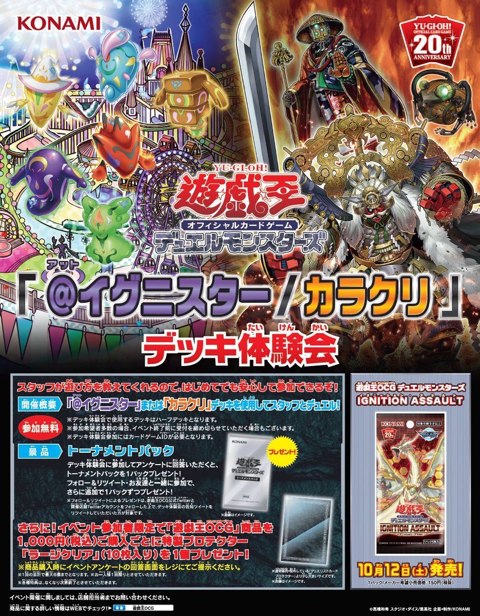 From October 3rd to the 11th, players in Japan will have a chance at their local official card shop to test out a 20 card “Ignister” or “Karakuri” Deck using the cards from Ignition Assault, along with staff giving them a rundown of how the Deck works.