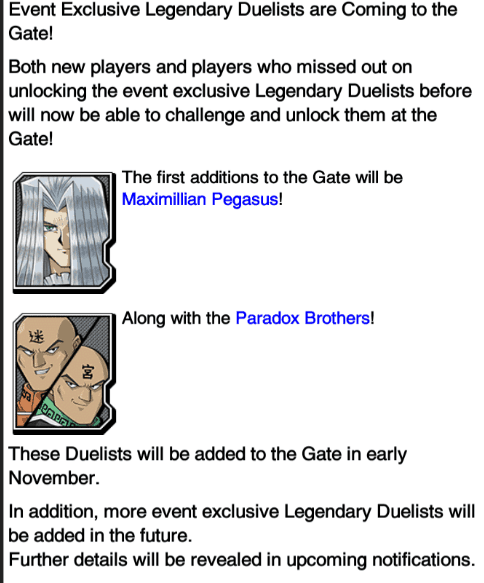 It seems two Legendary Duelists are being moved to the Gate where you can more easily obtain them.