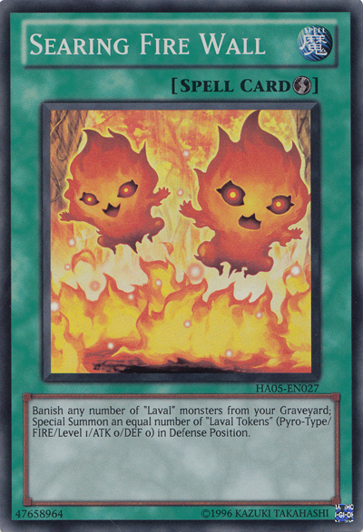 We’ve found a strong combo, we’ve found synergy, we’ve even got a backup plan in the form of Rekindling… Therefore, we’re left with the question of what else could a Pyro Burn deck need? What about even more tributes for Ignis? Once again, the Laval archetype pulls through for our purposes. Searing Fire Wall may seem useless or counterproductive to most Laval variants, but for our purposes, it is just another way to guarantee even more burn damage. You see, it is a way to generate 4 more tributes for your Ignis, and even though you are diminishing the total number of FIRE monsters in your Graveyard, you are still going to have some left due to the Volcanics. Even if you banish 4 Laval, (which is taking away 400 LP from Ignis tributing itself), all you need is 1 more FIRE monster in your Graveyard to use Ignis 5 times (once for each token and then itself) to get more damage than you lose. Let me clarify and bring us full circle: 100 Effect Damage per FIRE monster is admittedly not a lot of Effect Damage. But when you are able to use Ignis’s effect up to 8 or 9 times in a single turn, that damage really starts to add up! Hopefully I’ve convinced you of this creative deck’s potential, so let’s take a look at a sample decklist.