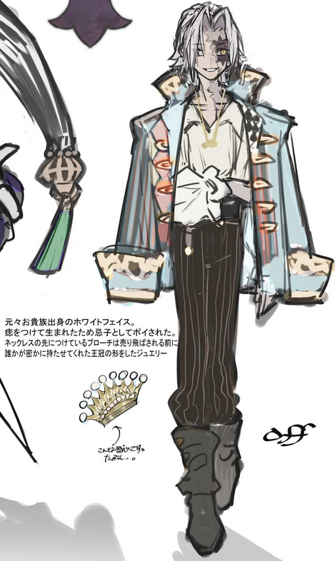 The brooch at the end of his necklace is jewelry shaped like a crown, which was given to him before he was disposed off.”