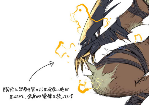 “Thick hair grows in the shape of spiraling clouds from the chest, unleashing electricity from all over her body”