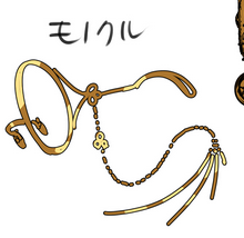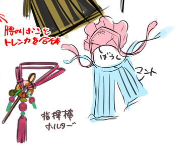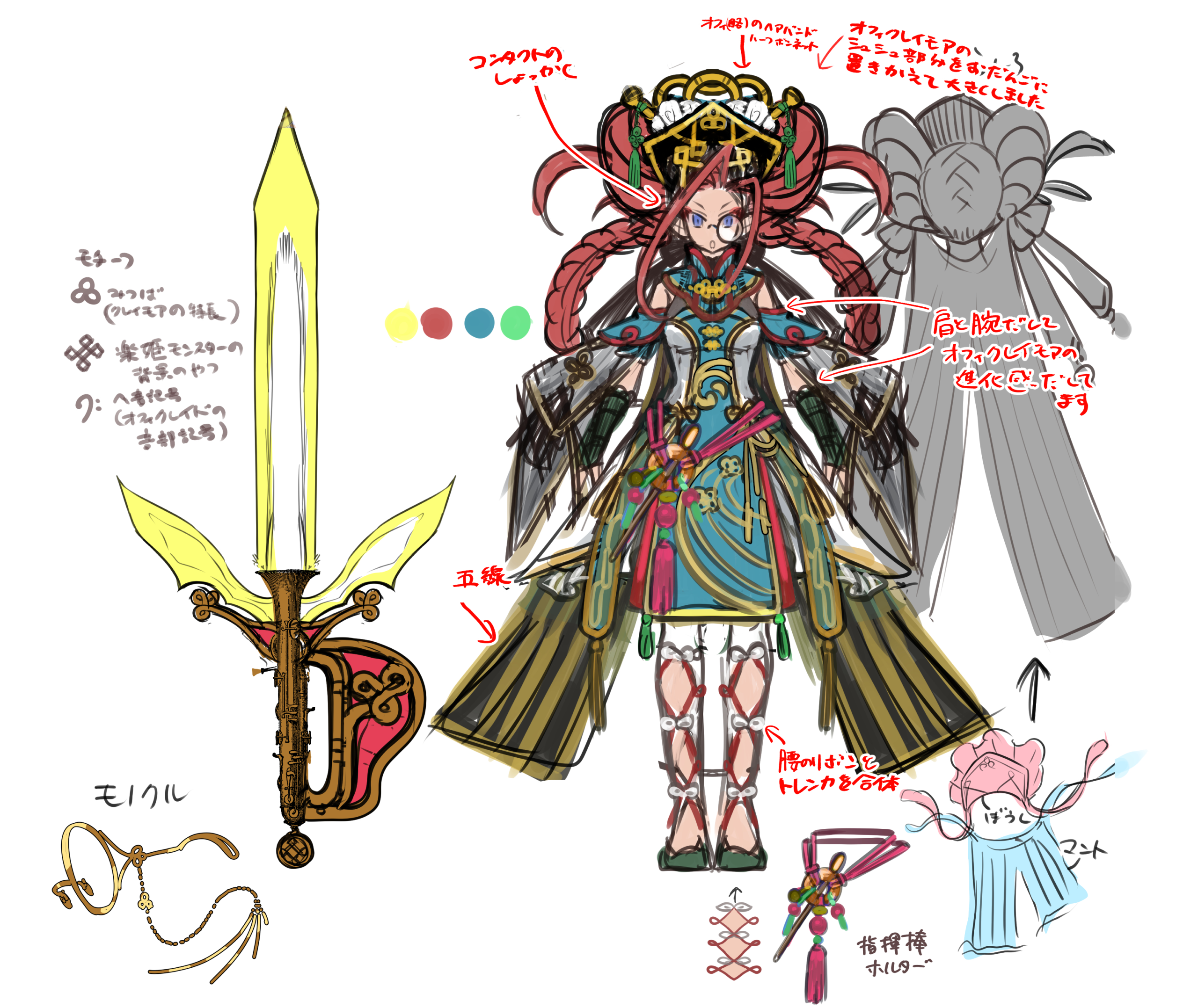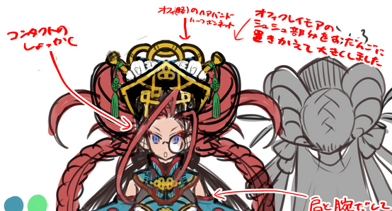 Right: “Ophiclaymore‘s [hair beyond the] scrunchie is replaced by buns and made larger”