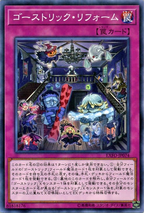 (2) You can banish this card from your Graveyard, then target 1 “Ghostrick” Xyz Monster you control; Special Summon from your Extra Deck 1 “Ghostrick” Xyz Monster with a different name from that target, using that target as Xyz Material. (This is treated as an Xyz Summon. Xyz Materials attached to that target also become Xyz Materials on the Summoned card.)