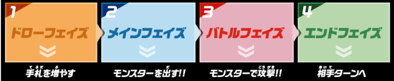 (1) DRAW PHASE (Increase your hand) -> (2) MAIN PHASE (Call forth Monsters!!) -> (3) BATTLE PHASE (Attack with Monsters!!) -> (4) END PHASE (On to your opponent’s turn)