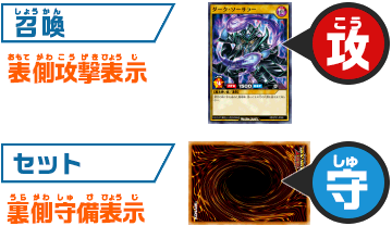 A monster that has been on the field since the last turn can change its Battle Position once per turn. If it was in Attack Position it becomes Defense Position, and if it was in Defense Position it becomes Attack Position. Also, if a monster that was face-down becomes face-up, that is called “flipping face-up”.