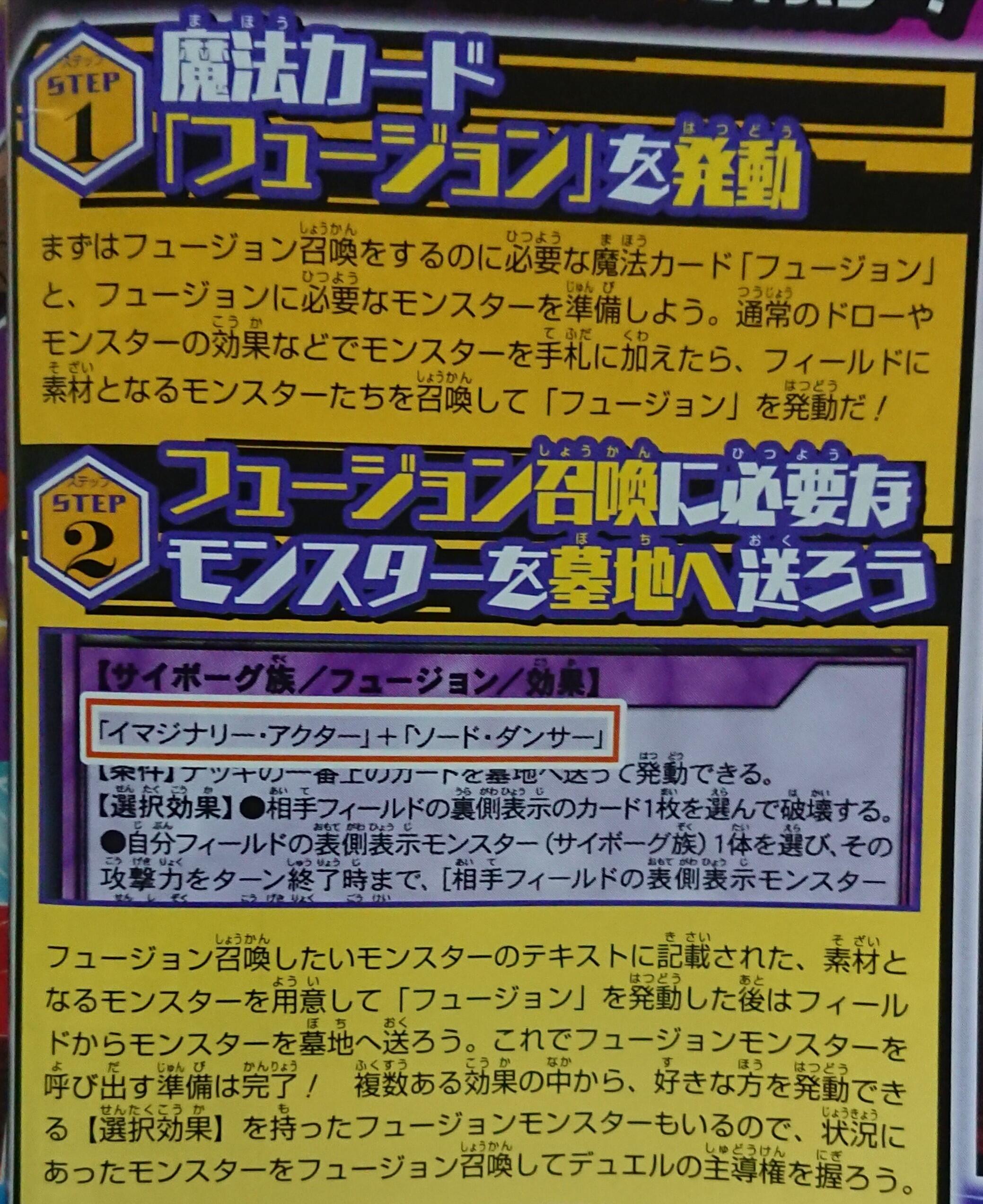 NOTE: As we mentioned when these cards debuted in the anime, the Spell Card and the fused monsters do not use the same term as the OCG counterpart 融合 (yuugou), but rather フュージョン (the English word “Fusion”). We’re sticking with Fusion for both the Spell Card and the fused monsters for the moment.