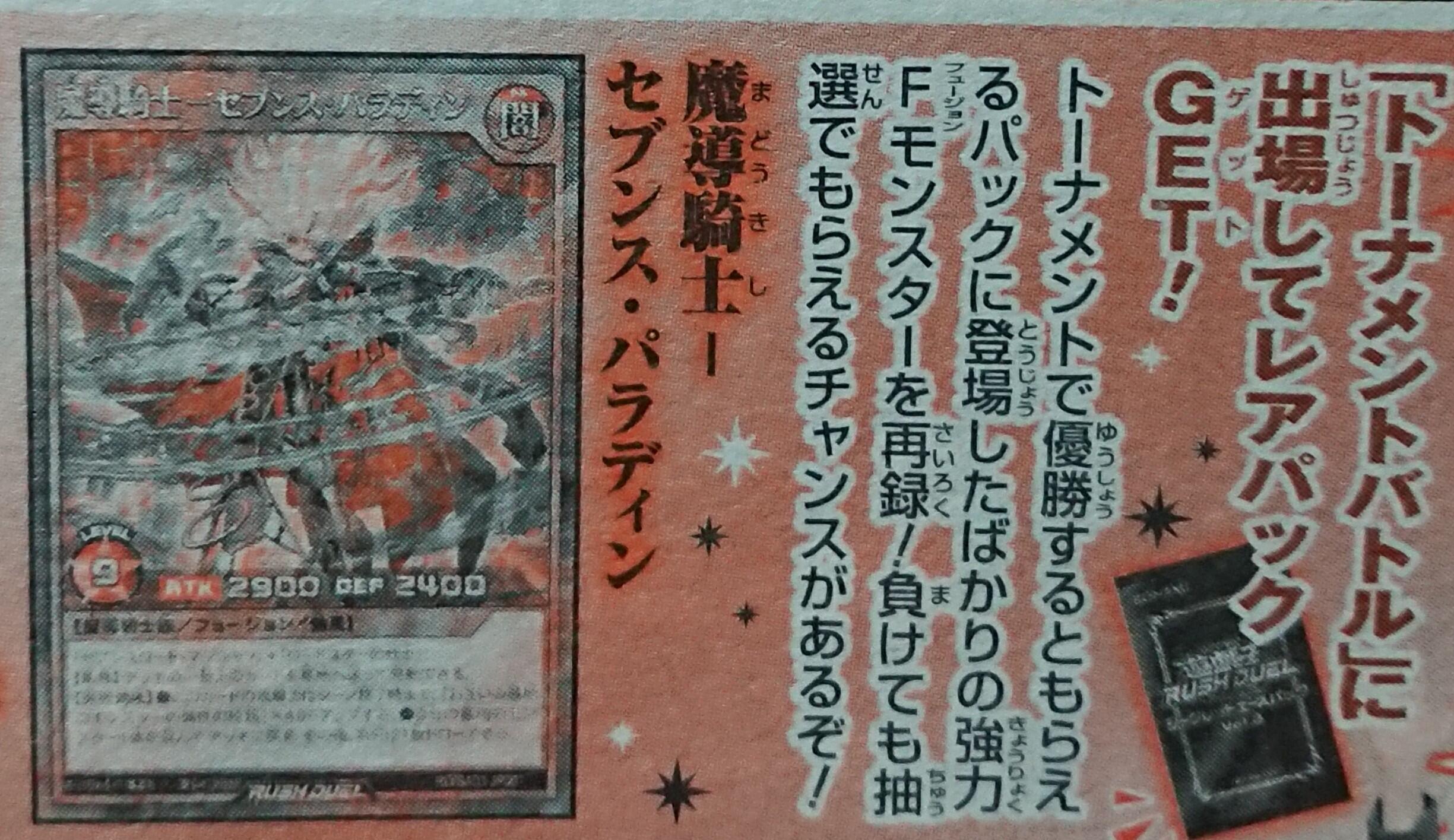 “Obtain a rare pack by participating in Tournament Battles! These powerful Fusion Monsters that have just been released are getting a reprint in this pack that you can obtain by winning the tournament! Even if you lose, you can still participate in a raffle for a chance to get one! Sevens Paladin the Magical Knight”