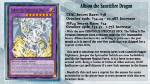 With the new CHRONICLES STRUCTURE DECK: The Fallen & The Virtuous releasing for OTS Tournament Stores today, and with the past few weeks, it has caused a few cards to rise in price. Albion the Sanctifire Dragon is one of the major offenders, as it is the be-all and end-all final Fusion form for the Story of White Lore, being a Fusion of both Fallen of Albaz and Incredible Ecclesia, the Virtuous. While this card wasn’t reprinted in the Chronicle Deck, it’s extremely powerful that it should’ve been reprinted. Requiring Fallen of Albaz and a LIGHT Spellcaster monster makes it so Albion is extremely easy to Fusion Summon, thanks to multiple LIGHT Spellcasters being run in Branded from Blazing Cartesia, the Virtuous, and Guiding Quem, the Virtuous. The main reason every Branded Despia Deck runs Albion is for its ability to quickly target 2 monsters in any GY(s) and Special Summon 1 to each field, which allows you to Special Summon plenty of cards that lock the opponent out of the game. This is one of the reasons cards like Gimmick Puppet Nightmare and Ido the Supreme Magical Force saw massive play in Branded Decks. Be aware that this Quick Effect can only be used during the opponent’s turn, so cards like Artifact Mjollnir will not work.