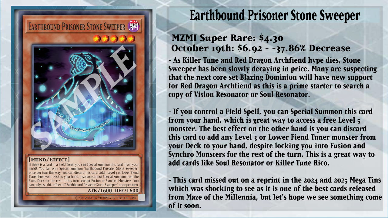 Next up, Earthbound Prisoner Stone Sweeper has been in a crossfire, as plenty have picked up cards for Earthbound and Red Dragon Decks in anticipation of Blazing Dominion’s cover theme possibly supporting Everyone’s King, Jack Atlas. Even then, this card can be extremely useful in Decks like Killer Tune (YGOrganization Translation), as it can discard itself to search for any Level 3 or Lower Fiend Tuner from your Deck, but it locks you into Fusion and Synchro Monsters for the rest of the turn. You can search out Killer Tune Reco (YGOrganization Translation) to net advantage, since when she is Summoned, she can add any Killer Tune monster from your Deck or GY to your hand to forward your Synchro plays.