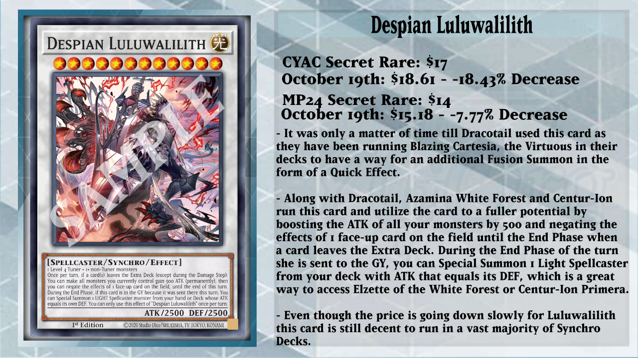 To finish off the trio, Despian Luluwalilith has also gone up in price as she still sees play in Decks like Azamina White Forest and Centur-Ion and has also become a common tech nowadays in Dracotail Decks that utilize Blazing Cartesia, the Virtuous. Even though she requires a Level 4 Tuner and 1 or more non-Tuner monsters, she is almost completely generic for any deck that can utilize this powerful Synchro Monster. When a card leaves the Extra Deck, you can, once per turn, make all monsters you currently control gain 500 ATK, then you can negate the effects of 1 face-up card on the field until the end of the turn, which could be a determination point for a match. Then during the End Phase, if she was sent to the GY that turn, you can Special Summon 1 LIGHT Spellcaster from your hand or Deck whose ATK equals its own DEF. This is extremely useful, as she allows you to access a second copy of Blazing Cartesia from your Deck for follow-up Fusion plays during your next turn.