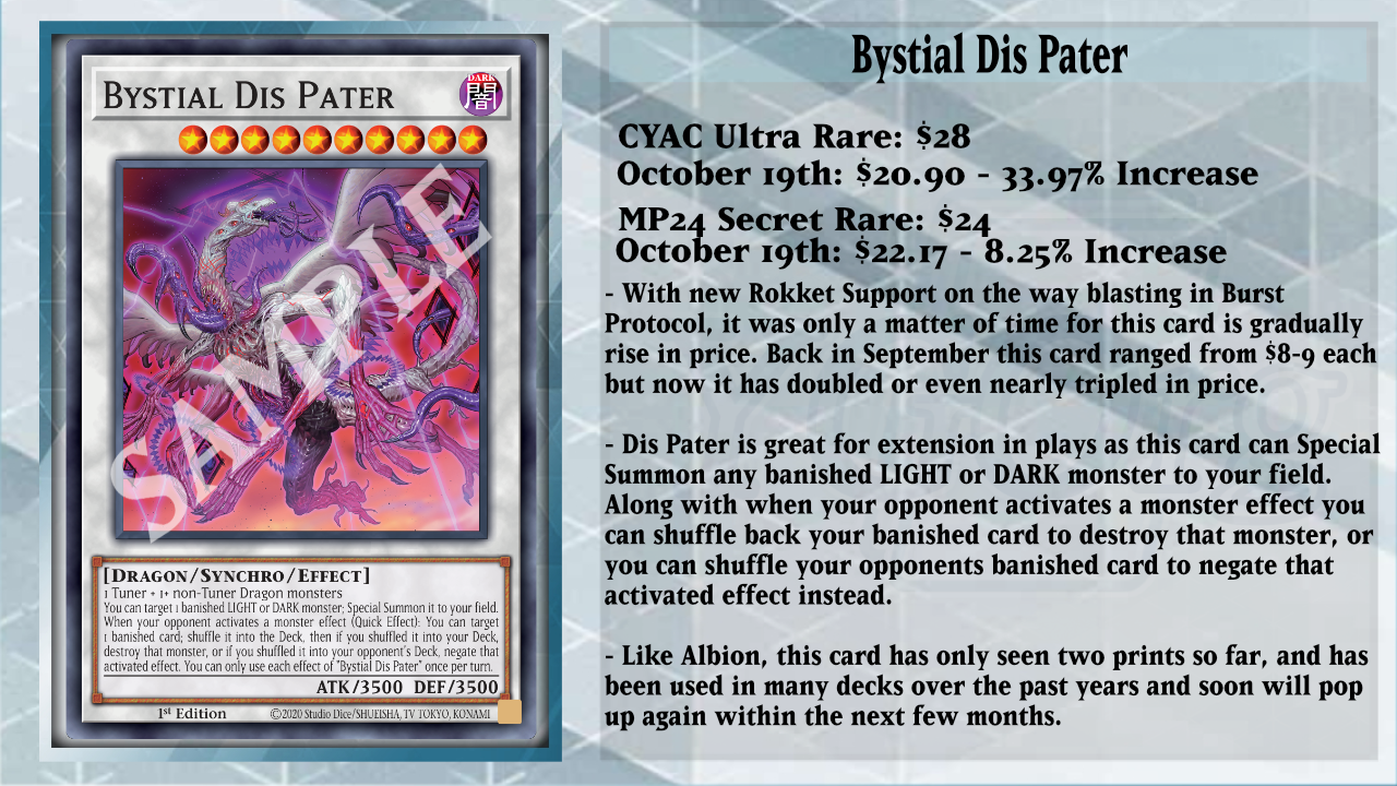Along with Sanctifire Dragon, Bystial Dis Pater has swiped off the North American market, with both the Cyberstorm Access Ultra Rare and 25th Anniversary Tin: Dueling Mirrors Secret Rare copies nearly gone. With Dis Pater being the Big Bad Evil Guy’s dragonic form in the Story of White Lore, it’s a shame that we haven’t seen a new accessible or lower rarity reprint for this card. With it being semi-generic and having 1 Tuner plus 1 or more non-Tuner Dragon monsters as its materials, this powerful 3500 ATK Synchro Monster can target and Special Summon any banished LIGHT or DARK monster that can help extend your plays or solidify your end boards with adding more interruption to it. This is because when your opponent activates a monster effect, you can quickly target 1 banished card and shuffle it into the Deck to destroy that monster, or if you shuffle it into your opponent’s Deck, the effects of that monster are negated instead.