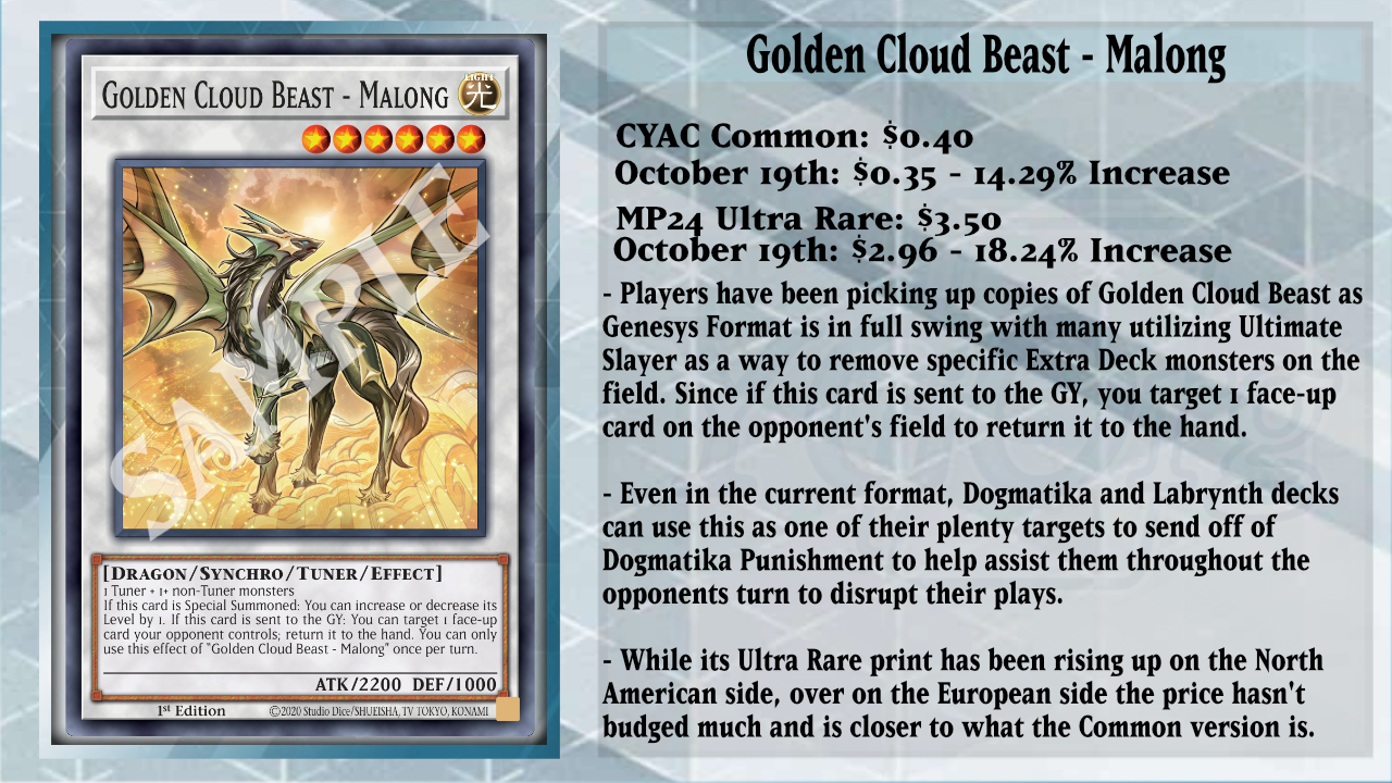 Golden Cloud Beast – Malong has been a great Synchro Tuner that has seen plenty of play in the Genesys Format as many have been utilizing it with Ultimate Slayer. Paired with Slayer, it adds another form of removal to the opponent’s board, as if this card is sent to the GY, you target 1 face-up card your opponent controls and return it to the hand. Removing any Synchro Monster on the field and an additional face-up card on the field on top of that are extremely important for tempo and breaking the opponent’s board. Even in the current TCG format, it’s great against the Synchro Snack Cat Deck, Yummy, to be sent off of Slayer, or used with Dogmatika Punishment for nearly the same effect as multiple forms of removal.