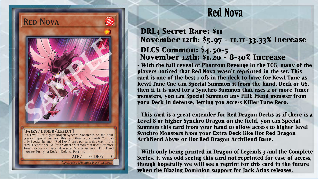 Finally, the card that was the most shocking to see not reprinted in Phantom Revenge is Red Nova, as it is a great card to Special Summon off of Kewl Tune Cue, as it can Special Summon any Tuner from your hand, Deck, or GY, with the downside of locking you into only being able to Special Summon Tuners for the rest of the turn. Why is Red Nova important for Kewl Tune? Well, if it is used as a Synchro Material for a Synchro that needs 2 or more Tuners, you can Special Summon 1 FIRE Fiend monster from your Deck in Defense Position, letting you access a copy of Kewl Tune Reco. When Kewl Tune Reco is summoned, you can add 1 Kewl Tune monster from your Deck or GY to your hand that isn’t a Level 3 for further extension in your combos. Outside of Kewl Tune using this card, Resonators can use this card extremely well, as they are all centered around Red Dragon Archfiend and the new support from Blazing Dominion, as you can Special Summon Soul Resonator straight from your Deck to let you add 1 Level 4 or lower Fiend monster from your Deck to your hand.