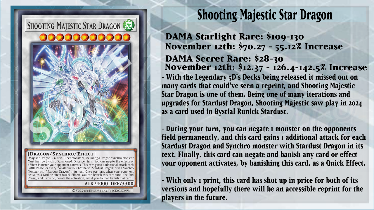 For the first part, we will be looking at cards that don’t have a reprint since their release and have been rising up in price, and a good place to start is looking at Shooting Majestic Star Dragon. This cover card from Dawn of Majesty hasn’t seen a reprint since its release, and many players picked up copies of the card for the Legendary 5D’s Decks, which contain new cards for the Junk Warrior and Synchron strategies. Even though this card needs Majestic Dragon and a non-Tuner monster, including a Dragon Synchro Monster, you can use a copy of Converging Wills Dragon, as it becomes Majestic Dragon while on the field or in the GY. Once per turn, you can choose 1 Effect Monster your opponent controls and negate its effects permanently. In addition, this card gains 1 additional attack each Battle Phase for every Stardust Dragon or Synchro Monster with “Stardust Dragon” in its text. This makes it so this 4000 ATK beatstick can OTK your opponent out of nowhere. Finally, when your opponent activates a card or effect, you can quickly banish this card (until the End Phase) to negate the activation of that card/effect and banish that card.