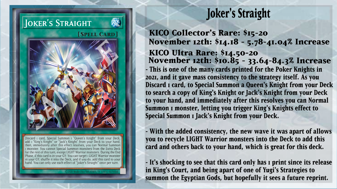 For the last strange oddity, we will look at Joker’s Straight from King’s Court. The listings on the NA market are less than 20 copies between the Ultra Rare and Collector’s Rare versions, while on the EU market, there are more quantities, but the price is still above $8/€7. This is a card that is the center of the Poker Knight monsters, as you can discard 1 card to Special Summon 1 Queen’s Knight from your Deck and add a copy of King’s or Jack’s Knight from your Deck to your hand. Then after this card resolves, you immediately Normal Summon 1 monster. This is useful, as it allows you to Normal Summon your searched King’s Knight to now let you Special Summon 1 Jack’s Knight from your Deck. This helps set up a Tribute Summon for an Egyptian God monster, the Fusion Summon of Arcana Knight Joker, or the Link Summon of Arcana Extra Joker. With this card, it sets up many options for the Poker Knights, and during the End Phase, you can shuffle a LIGHT Warrior from the GY into the Deck to add this card back to the hand.