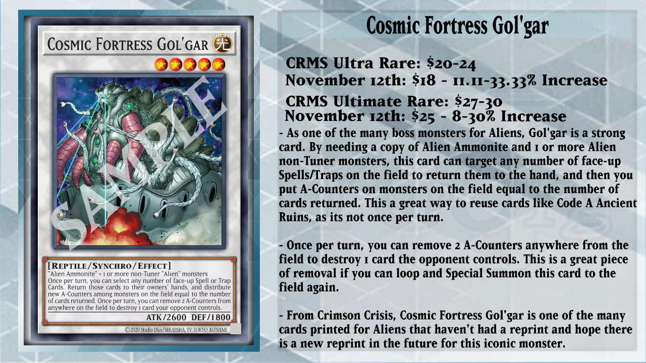 Next up, Cosmic Fortress Gol’Gar and Code A Ancient Ruins are an Alien duo that haven’t seen a reprint since their release in Crimson Crisis. Gol’gar is the only Synchro Monster to the Alien theme, and it is an extremely powerful monster for them. This card needs an Alien Ammonite and 1 or more non-Tuner Alien monsters for its Synchro Summon, which is rather restrictive. It’s worth it, however, as it can target any number of face-up Spells/Traps on the field to return them to their owners’ hands and place A-Counters on monsters currently on the field equal to the number of cards returned. On top of this, you can, once per turn, remove 2 A-Counters from anywhere on the field to destroy 1 card your opponent controls. This allows you to fuel Code A Ancient Ruins’ ability to Special Summon 1 Alien monster from your GY or debuff your opponent’s monsters with Cosmic Slicer Zer’oll, forcing the opponent’s monsters into Defense Position, and neither player can activate their effects while they have A-Counters.