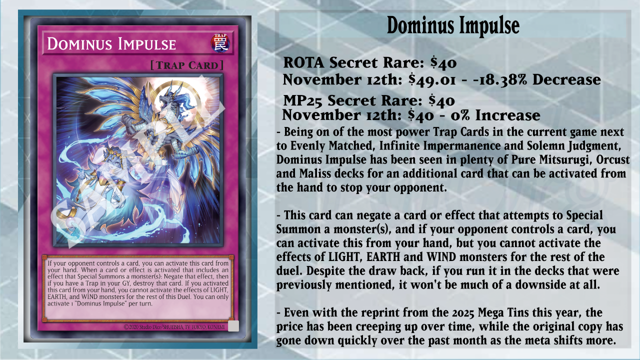 Next happens to be one of the Trap Cards that have been dominant in DARK, FIRE, and WATER Decks, Dominus Impulse. While your opponent controls a card, you can activate it from your hand, but you cannot activate LIGHT, EARTH, and WIND monster effects for the rest of the Duel by doing so, which is a fair balance for the card, as it negates any card or effect that is activated that includes the effect to Special Summon a monster(s). Having such a counter is extremely strong in the current game, where it’s all based around multiple combo lines, from stopping Mitsurugi Ritual, Dracotail Rahu/Dracotail Ketu/Dracotail Faimena, or even Lollipo★Yummy Way and the other Yummy Synchro Monsters. The upside is that if you have a Trap Card in your GY, it destroys the negated card, which could benefit the player using it.