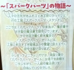 There, the “Sparkhearts” family sell spellbooks and handmade potions. One of the business’ employees is a new witch, “Sparkhearts Girl”. She runs around the town meeting the needs of customers who visit their atelier requesting certain jobs.