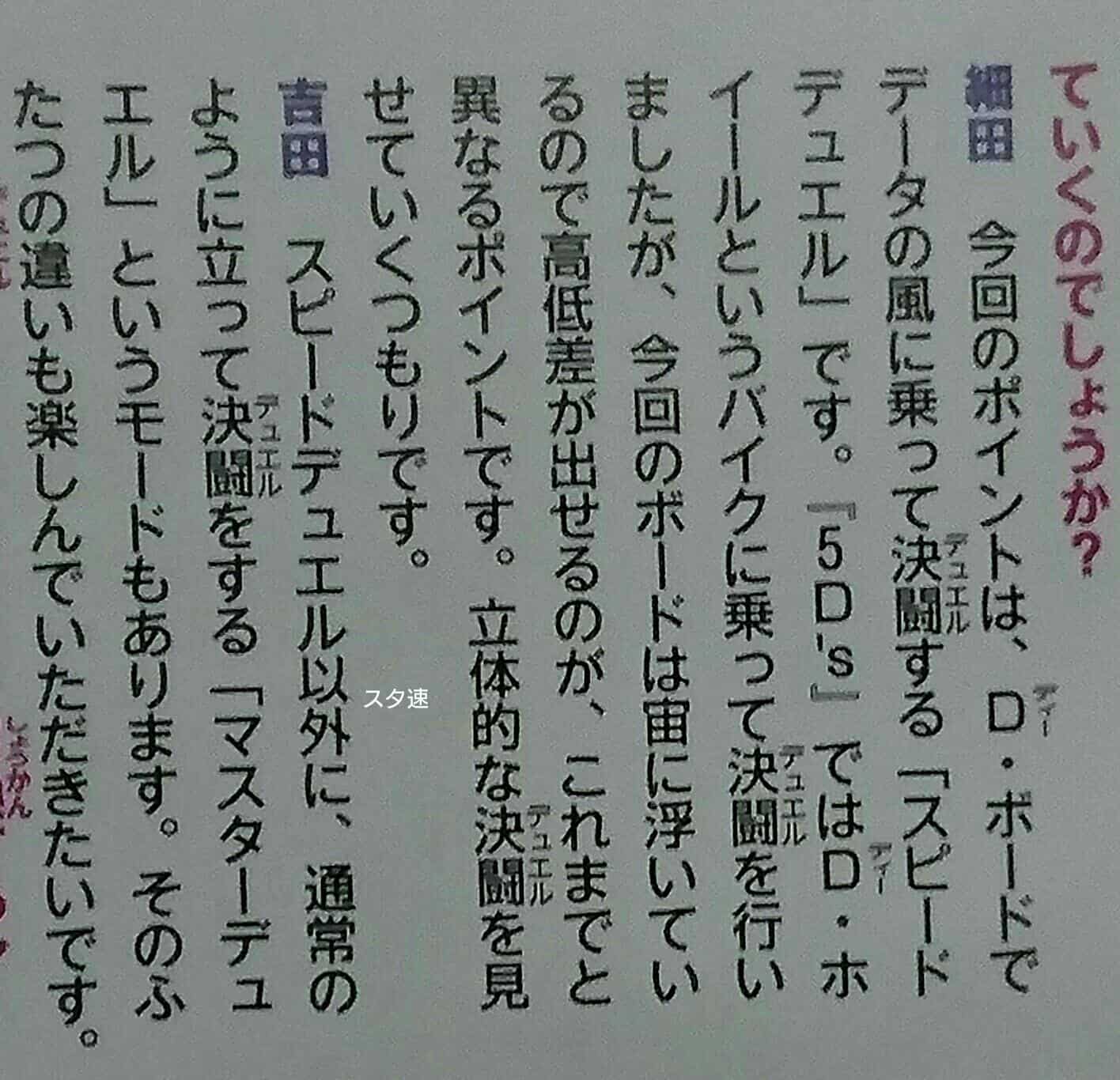 The Speed Duel Format in the show will be similar to Riding Duels in 5D’s, but you can also move up and down, besides just going straight forward, using your D-Board. (It isn’t explained if it also uses the Speed Duel rules of 3 Monsters and 3 S/Ts).