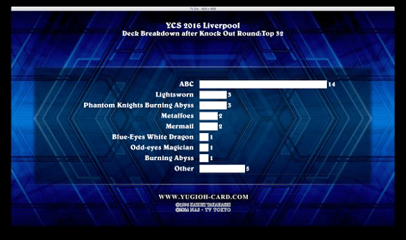 Things get much more interesting and accurate with the last YCS held on October 29/30 in Liverpool. The reason is because the Structure Deck: Seto Kaiba which was released on October 20 was legal for this event. ABC was a big competitor in the OCG after its release and most players expected it to perform strong in the TCG as well. If we have a look at the official Top 32 deck breakdown we definitively see they were right: