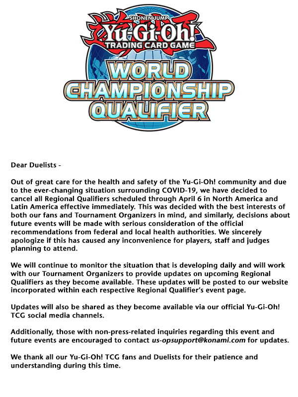 Out of great care for the health and safety of the Yu-Gi-Oh! community and due to the ever-changing situation surrounding COVID-19, we have decided to cancel all Regional Qualifiers scheduled through April 6th in North America and Latin America effective immediately. This was decided with the best interests of both our fans and Tournament Organizers in mind, and similarly, decisions about future events will be made with serious considerations of the official recommendations from federal and local health authorities. We sincerely apologize if this has caused any inconvenience for players, staff and judges planning to attend.