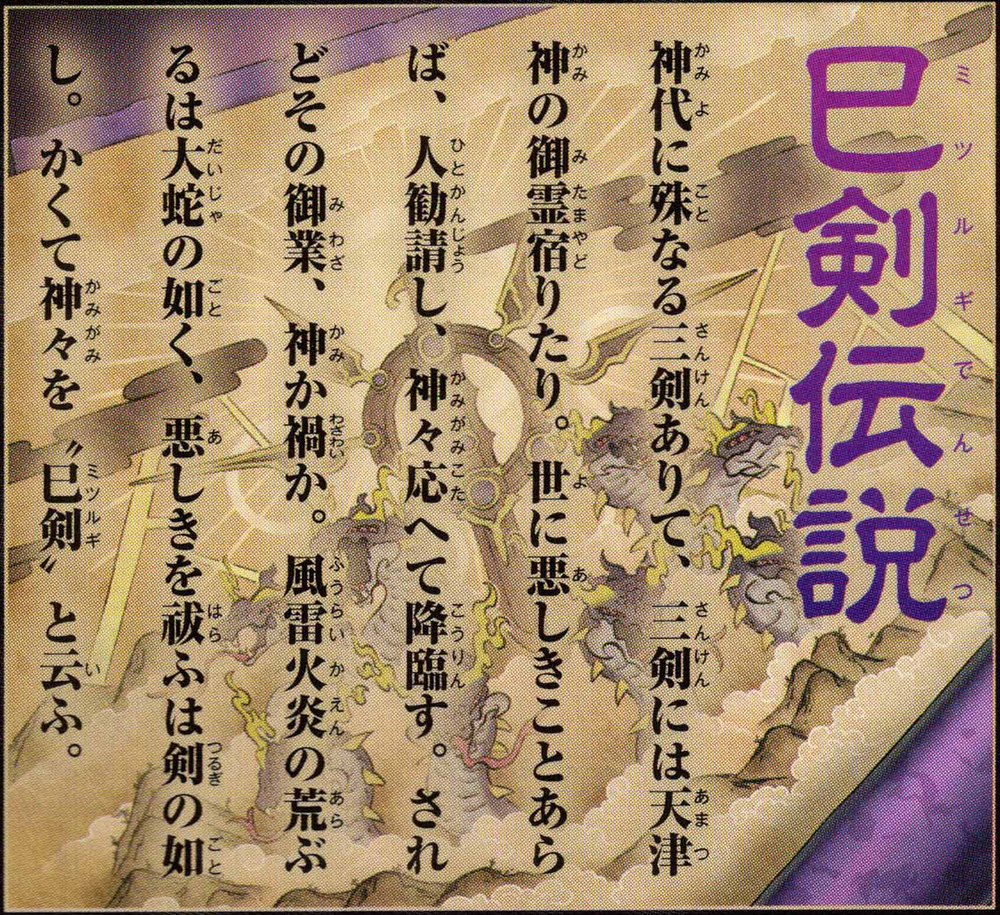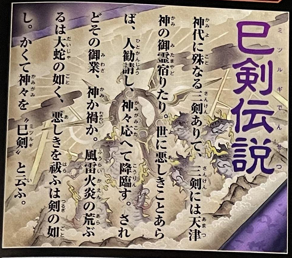 In the Age of the Gods, there were three singular blades, within which dwelt the Mitama of the Amatsugami. Should evil befall the world, men would offer up their prayers, and the gods would answer, descending unto the earth. Yet was this deed divine, or perchance a calamity? As the raging flames, borne upon the wind, take the form of a great serpent, so too is the sword that smiteth evil. Thus came the gods to be called “Mitsurugi.”