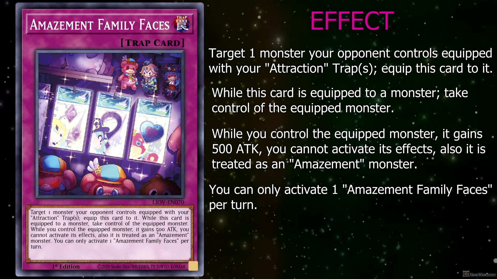 Target 1 monster your opponent controls equipped with your “Attraction” Trap(s); equip this card to it. While this card is equipped to a monster, take control of the equipped monster. While you control the equipped monster, it gains 500 ATK, you cannot activate its effects, also it is treated as an “Amazement” monster. You can only activate 1 “Amazement Family Faces” per turn.