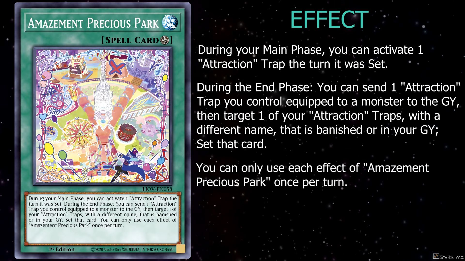 During your Main Phase, you can activate 1 “Attraction” Trap the turn it was Set. During the End Phase: You can send 1 “Attraction” Trap you control equipped to a monster to the GY, then target 1 of your “Attraction” Traps, with a different name, that is banished or in your GY; Set that card. You can only use each effect of “Amazement Precious Park” once per turn.