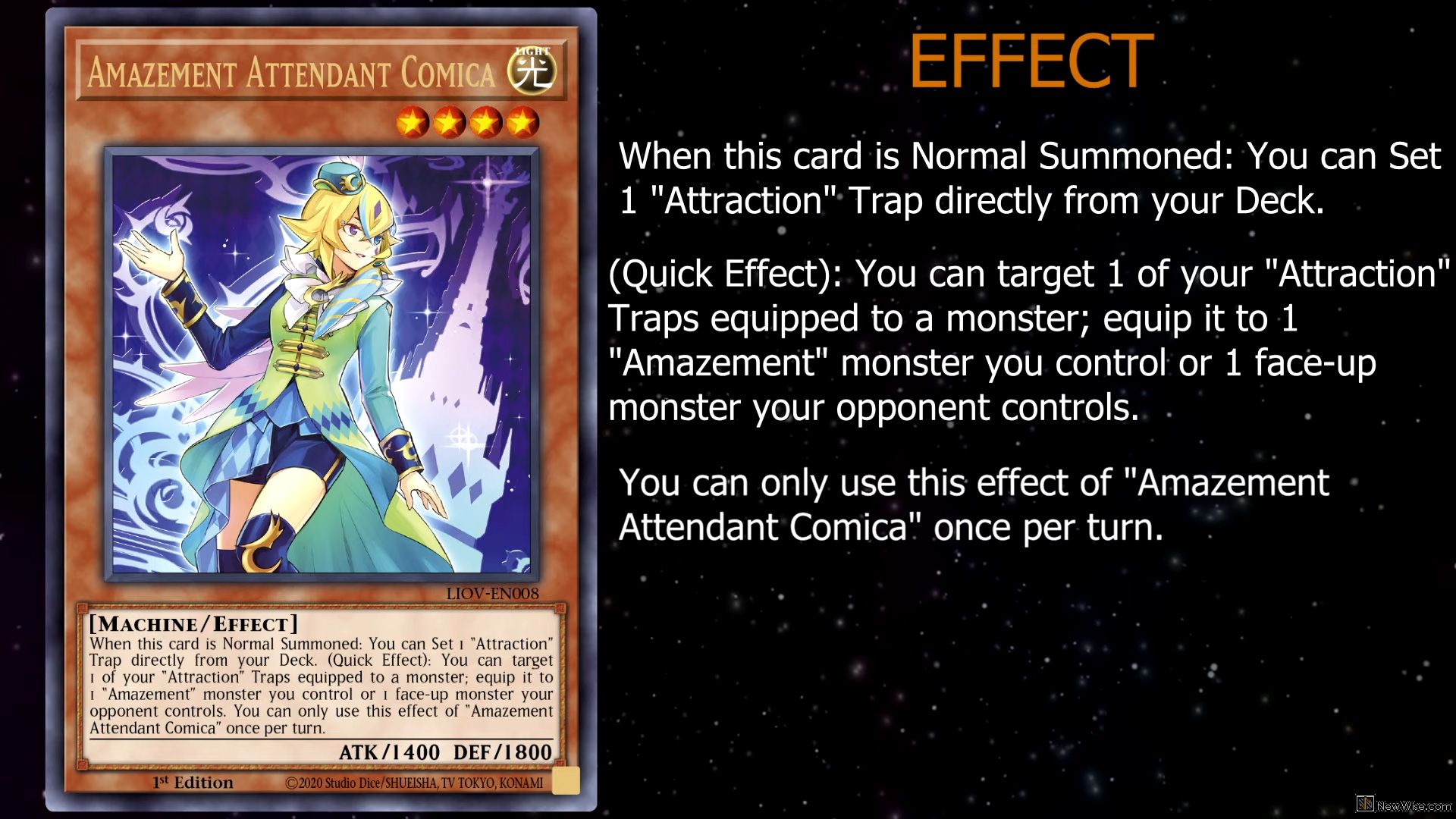 When this card is Normal Summoned: You can Set 1 “Attraction” Trap directly from your Deck. (Quick Effect): You can target 1 of your “Attraction” Traps equipped to a monster; equip it to 1 “Amazement” monster you control or 1 face-up monster your opponent controls. You can only use this effect of “Amazement Attendant Comica” once per turn.