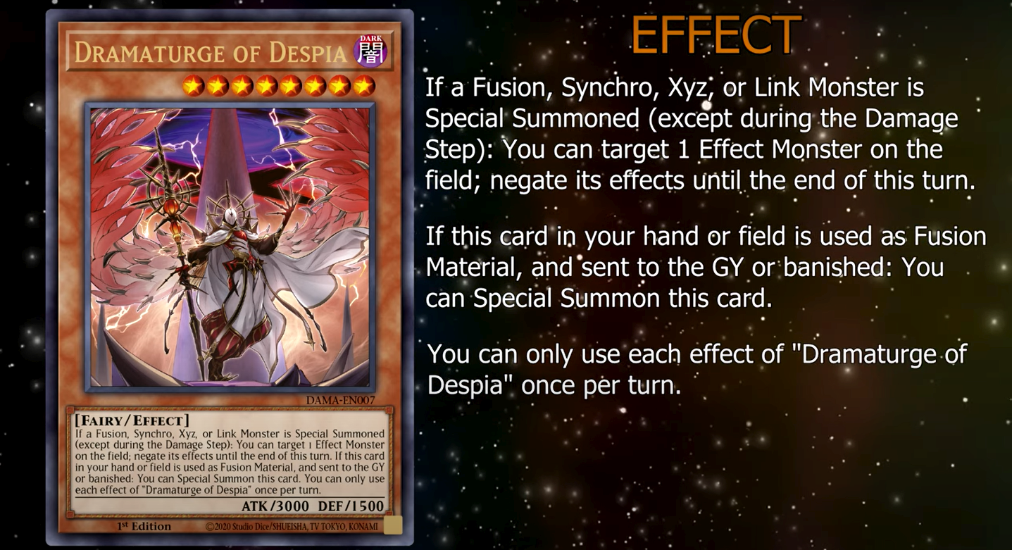 If a Fusion, Synchro, Xyz or Link Monster is Special Summoned (except during the Damage Step): You can target 1 Effect Monster on the field; negate its effects until the end of this turn. If this card in your hand or field is used as Fusion Material, and sent to the GY or banished: You can Special Summon this card. You can only use each effect of “Dramaturge of Despia” once per turn.