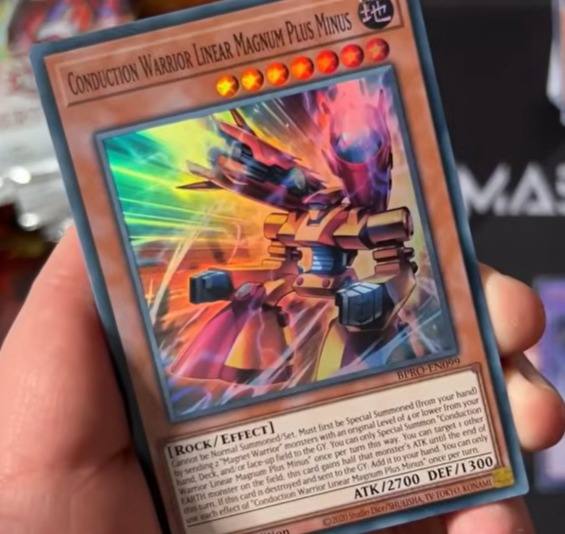 Cannot be Normal Summoned/Set. Must first be Special Summoned (from your hand) by sending 2 “Magnet Warrior” monsters with an original Level of 4 or lower from your hand, Deck, and/or face-up field to the GY. You can only Special Summon “Conduction Warrior Linear Magnum Plus Minus” once per turn this way. You can target 1 other EARTH monster on the field; this card gains half that monster’s ATK until the end of this turn. If this card is destroyed and sent to the GY: Add it to your hand. You can only use each effect of “Conduction Warrior Linear Magnum Plus Minus” once per turn.