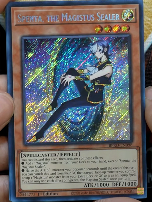 You can banish this card from your GY, then target 1 face-up monster you control; equip 1 “Magistus” monster from your Extra Deck or GY to it as an Equip Spell. You can only use each effect of “Spenta, the Magistus Sealer” once per turn.