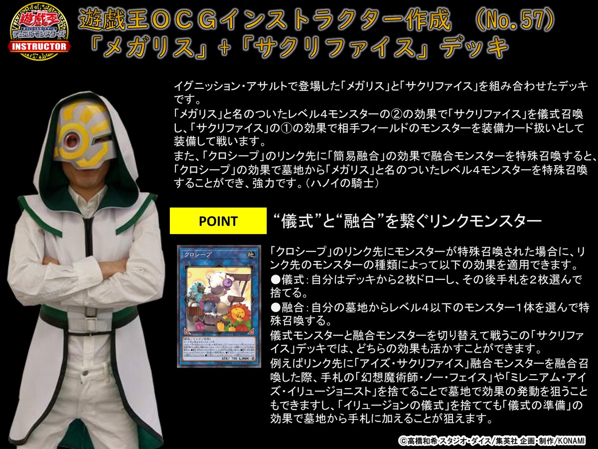 Also, by Special Summoning a Fuison Monster to a zone that “Crochet Sheep” points to by the effect of “Instant Fusion”, the effect of “Crochet Sheep” to Special Summon a Level 4 “Megalith” monster from the GY, is a pretty powerful combo.