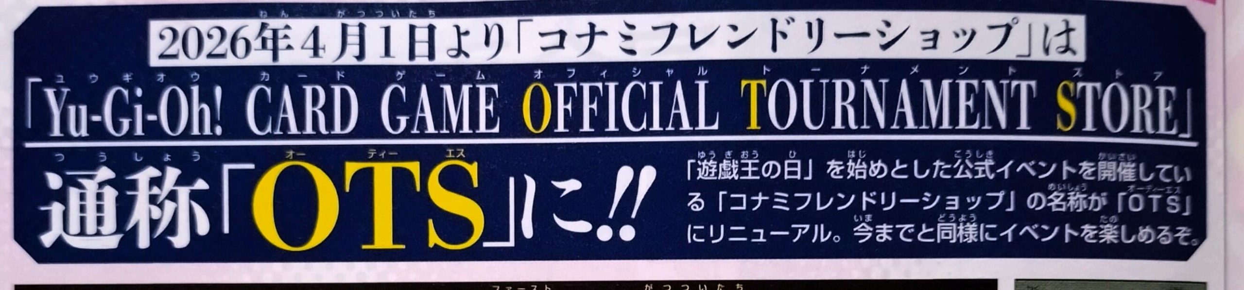 Starting April 1st, 2026, “Konami Friendly Shops” will be renamed “Yu-Gi-Oh! Card Game Official Tournament Stores” (short hand: “OTS”!). The “Konami Friendly Shops” you’re used to that have handled official events such as “Yu-Gi-Oh! Day” will be changing their terminology to “OTS”. The same events will continue to be held.