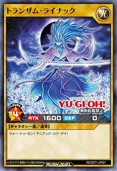 Join our Discord to discuss this article with fellow Duelists Become a Patron to support us for 12 years of all-volunteer work One of Yudias’ signature monsters is revealed, it’s a little… shorter than expected. RD/SST1-JP01 トランザム・ライナック Transamu Rainac Level 4 LIGHT Galaxy-Type Normal Monster ATK 1600 DEF 0 ウォー・トゥ・ゼン!マニアック・ユウ・ダイ! (War To Zen! Maniac You Die!) Source