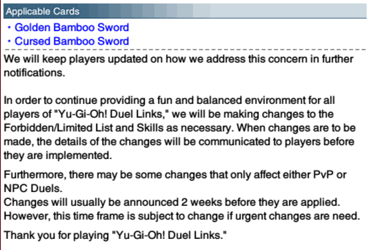 Konami is considering what to do about “Golden Bamboo Sword” and “Cursed Bamboo Sword” should they remain a problem.